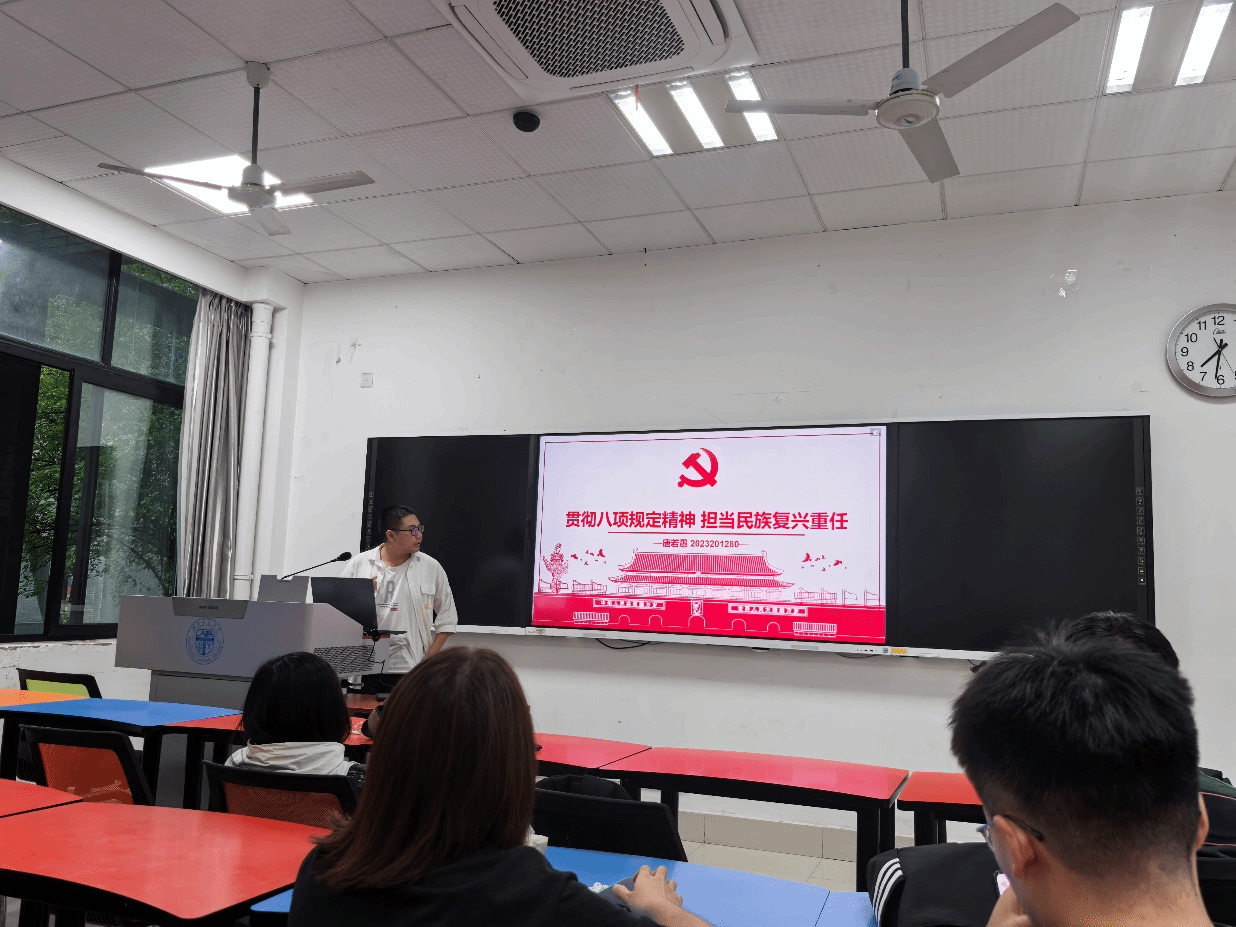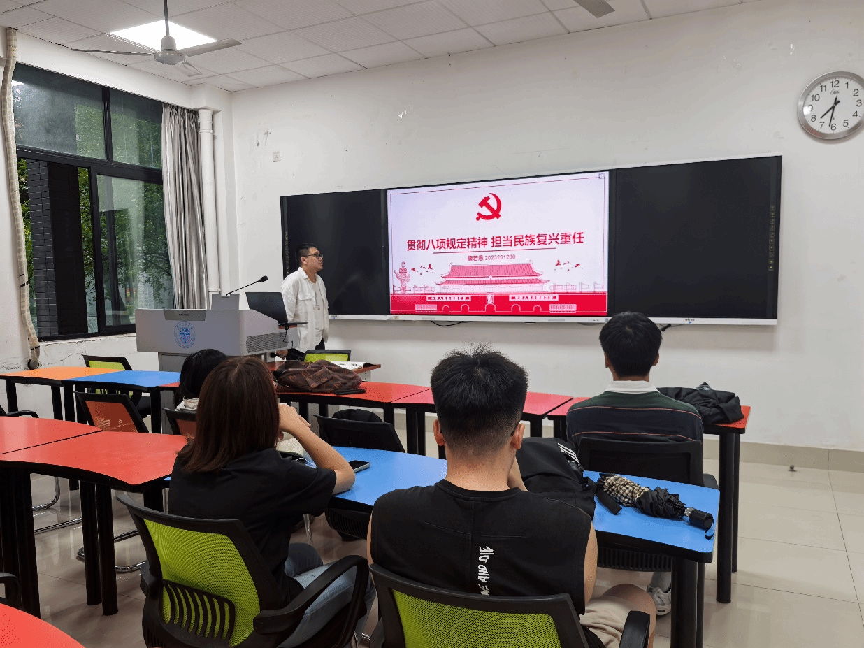 党支部书记唐若愚给大家带来的是主题为“贯彻八项规定精神 担当民族复兴重任”的内容讲述。首先,他引用《中国青年报》上的一段话作为党课开头,引出制定和落实中央八项规定的里程碑意义。接下来,他主要从三个方面进行讲述,分别是“贯彻中央八项规定精神成效和经验”、“典型案列分享”、“动真碰硬,久久为功”。在第一个部分的讲述中,他详细介绍了贯彻中央八项规定精神成效和经验。随后,他给大家播放一条严重违反中央八项规定精神问题的新闻视频以及中央纪委办公厅公开通报3起整治形式主义为基层减负典型问题的一些典型案例,使得支部全体成员直观深刻的了解到贯彻八项规定精神的重要性与必要性。最后,他清晰地阐述了贯彻八项规定精神的多个总结经验,并呼吁支部全部成员要学习八项规定精神,正本清源,严格遵守八项规定,树立底线意识,主动拒绝诱惑,明辨是非。