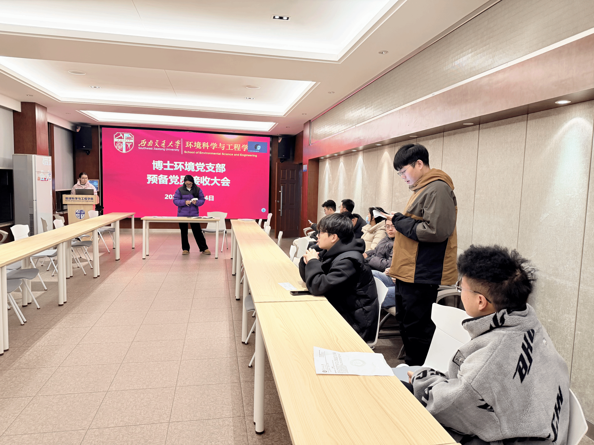 2025年12月4日,博士环境党支部召开12月主题党日活动暨预备党员接收大会、预备党员转正大会,本次会议重点围绕“学习宣传贯彻党的二十届四中全会精神,以教育强国建设支撑引领中国式现代化”,并开展专题学习研讨、预备党员接收及转正等重要议程,共24名同志参加,其中正式党员20名。大会由党支部书记朱欢欢主持。