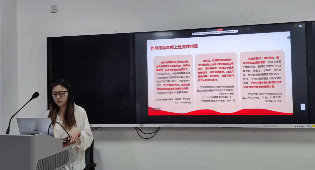 会议第一项,闫灵洁同志带领大家学习《习近平关于加强党的作风建设论述摘编》。闫灵洁同志分别从“党的作风问题关乎人心向背,决定党和国家事业成败”、“作风问题本质上是党性问题”、“作风问题核心是党同人民群众的关系问题”、“中央八项规定是改进作风的切入口和动员令,是长期有效的铁规矩、硬杠杠”、“持续深化纠治‘四风’”、“各级领导干部要带头转变作风,身体力行,以上率下”、“坚持正风肃纪反腐相贯通”、“使党的作风全面纯洁起来,以优良党风带动社风民风向上向善”、“推进作风建设常态化长效化”九个部分带领大家学习,以中央八项规定精神为主线,贯穿作风建设、治国理政与民生发展,强调通过制度约束、文化浸润和实干担当,筑牢党的执政根基,反腐反贪,为中国式现代化提供坚实保障。此外在领导大家学习的过程中,闫灵洁同志积极与党支部成员互动,调动大家思考,生动鲜活。