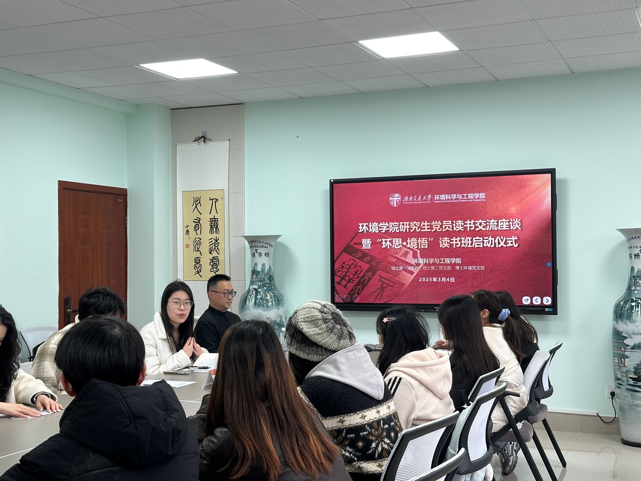 研究生党员读书交流座谈会暨“环思·境悟”读书会启动仪式。学院党委书记甘霖,辅导员赵瑞涵、黄泳桦,以及硕士第一、第二党支部及博士环境党支部学生党员到场参与。读书会由辅导员黄泳桦主持。