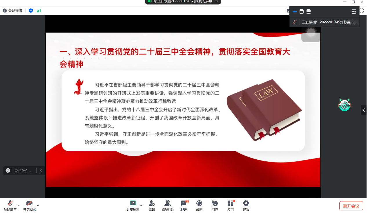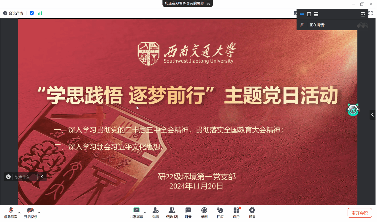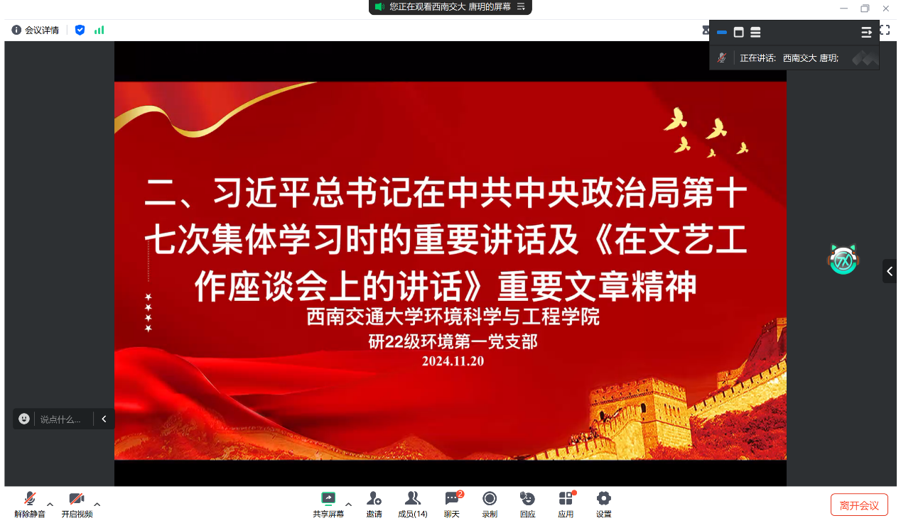 22级环境第一党支部于11月20日19:00在腾讯会议开展11月主题党日,主要目的是深入学习贯彻党的二十届三中全会精神,贯彻落实全国教育大会精神,以及深入学习领会习近平文化思想。本次活动的领学人为刘静雯和唐玥同志。