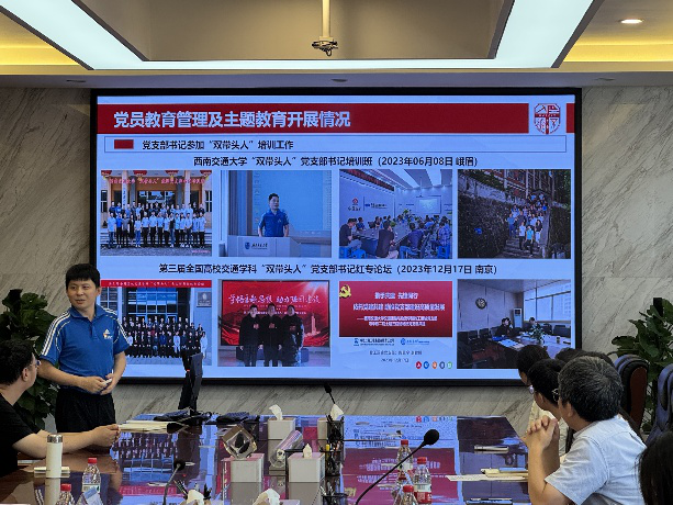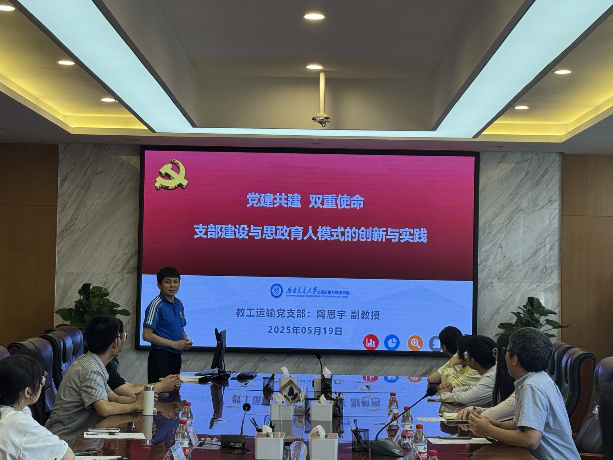 紧接着,交运学院陶思宇副教授围绕支部建设情况展开交流。他介绍了交运学院“两横三纵一合力”的育人体系模式,强调师生合作在支部建设中的重要性,分享了如何充分发挥支部战斗堡垒作用和党员的先锋模范作用,为支部建设提供了宝贵经验。