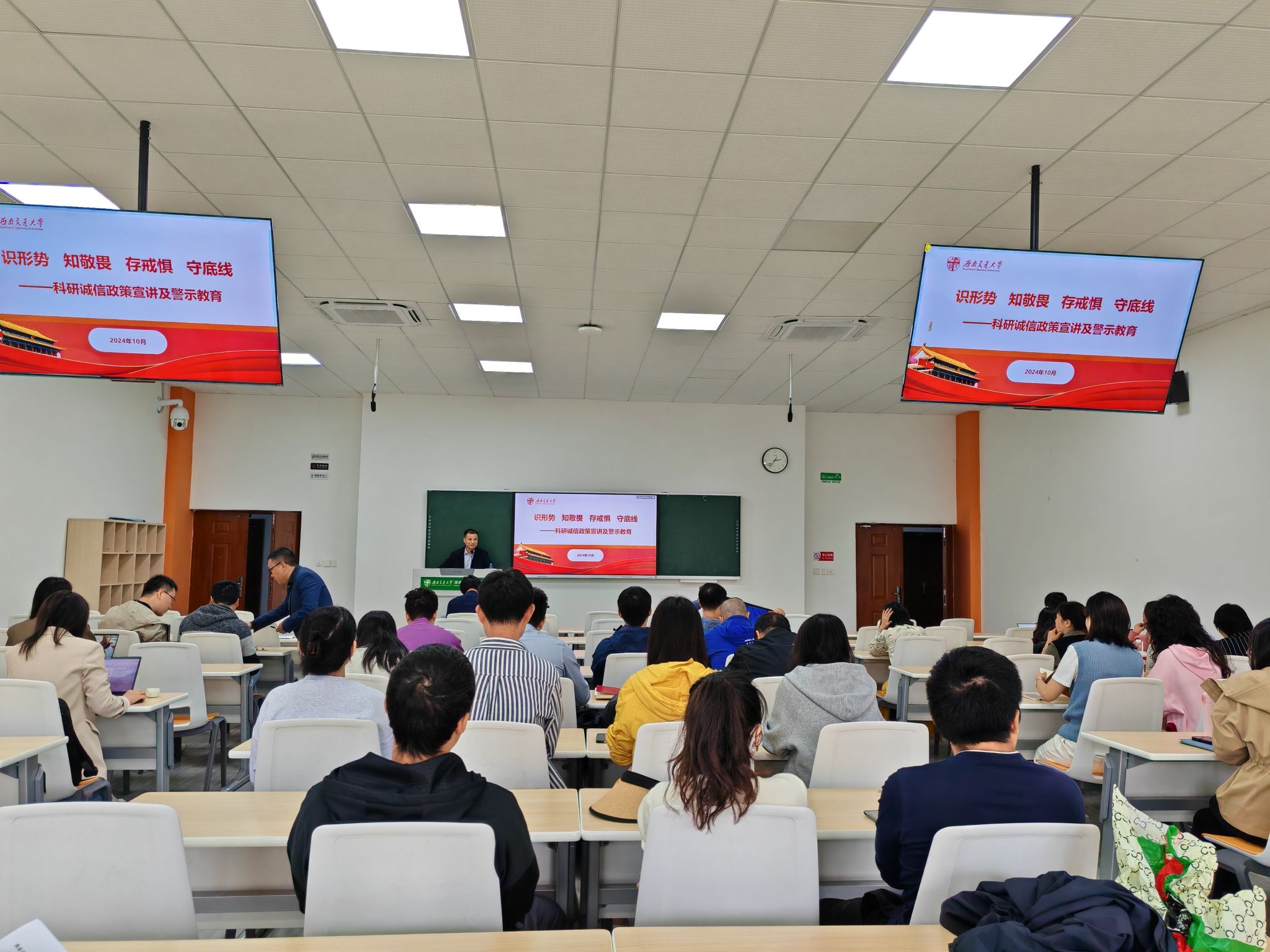 全体教职工作题为《识形势、知敬畏、存戒惧、守底线》的科研诚信政策宣讲及警示教育。