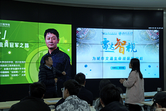 随后,张教授以我校在“互联网+”大学生创新创业大赛中的特等奖获奖项目“雷达智视——为城市交通生命线保驾护航”为案例,生动还原了从团队组建、技术攻坚到成果转化的完整历程。张教授强调跨学科组队和“硬件+软件”组合的重要性,同时还提出了“以赛助教,以赛助学”的观点,指出比赛需要老师与学生相互成就。