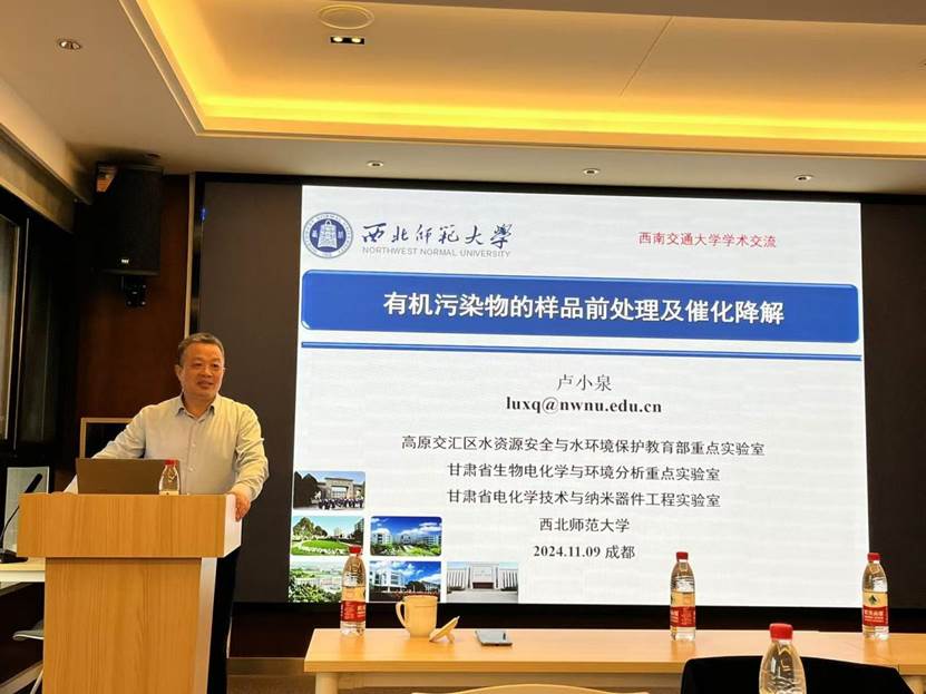 卢小泉教授围绕“有机污染物的样品前处理及催化降解”,介绍了近年来团队在环境领域针对水中新污染物的系列工作。新污染物包括持久性有机污染物、内分泌干扰物和抗生素等,其监测与治理是污染防治的新兴和重点研究领域。卢教授团队将电化学发光、电化学传感等技术应用在新污染物的分离与检测中,开创性的提出了基于噻咯有机分子的聚集诱导电化学发光检测塑化剂分子的策略,这一新体系成功解决了有机发光体普遍存在的非水溶性和聚集性猝灭(ACQ)等关键问题,首次实现了在水相中非水溶性有机物的电致化学发光。卢教授还介绍了基于不同吸光单元(半导体,聚合物,纳米簇等)催化降解新污染物的系列工作:通过超小金簇嵌入、FeOOH团簇修饰等方法提高了COF材料降解污染物的活性和稳定性;发展了多种性能优异的类芬顿催化剂;通过调控酸碱性促进了过硫酸盐体系对污染物的去除效率。卢教授还悉心地向同学传授了如何巧妙地将定性分析的基础知识应用到科研工作的反应设计中,卢教授深入浅出的讲解引起了现场师生的热烈讨论。