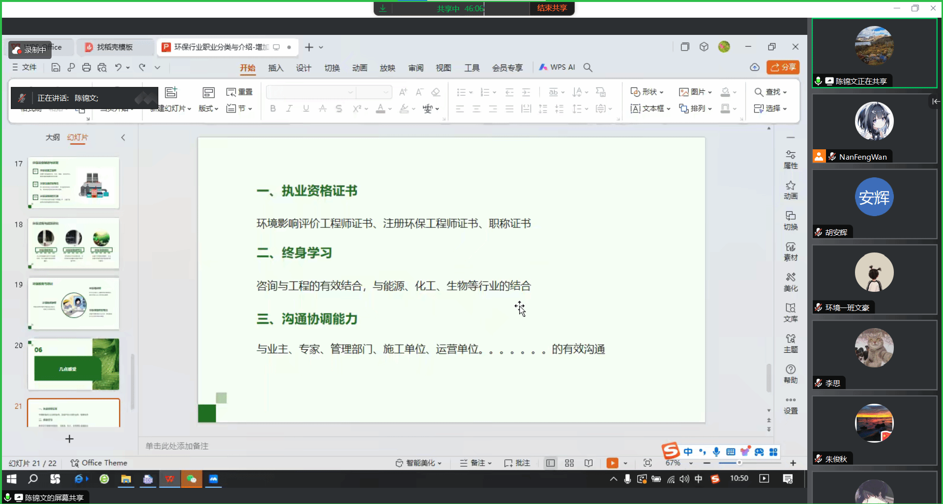 ,现就职于四川省生态环境科学研究院,任固体所副所长。尹朝阳学长从环境学科就业方向的角度出发,为同学们分析了各个职业选择的优势,帮助同学们梳理不同职业的工作内容和所需要的条件,分享他在就业时的经验和想法。他特别强调了同学们要发挥学习的主观能动性,培养终身学习的观念,主动积极学习行业最新的政策和方法,紧跟国家发展步伐,以此来提高职场竞争力。
