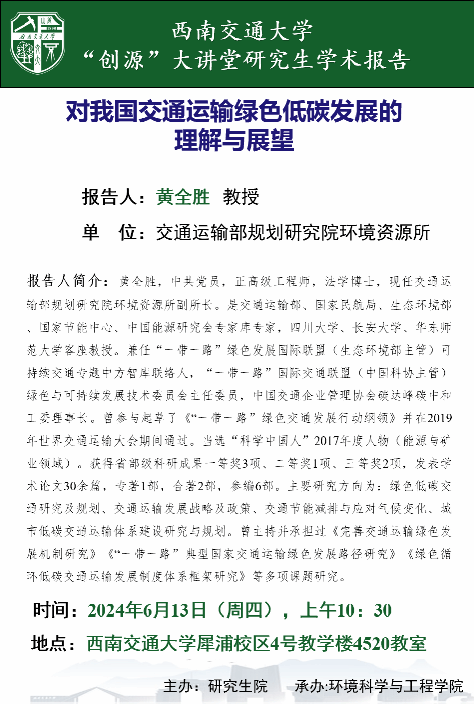 主讲人简介:黄全胜,中共党员,正高级工程师,法学博士,现任交通运输部规划研究院环境资源所副所长。是交通运输部、国家民航局、生态环境部国家节能中心、中国能源研究会专家库专家,四川大学、长安大学、华东师范大学客座教授。