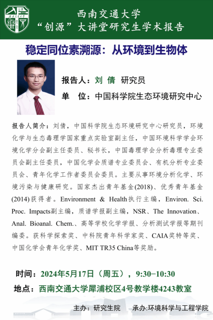 报告人简介:刘倩,中国科学院生态环境研究中心研究员,环境化学与生态毒理学国家重点实验室副主任,中国环境科学学会环境化学分会副主任委员、秘书长,中国毒理学会分析毒理专业委员会副主任委员,中国化学会质谱专业委员会、有机分析专业委员会、青年化学工作者委员会委员。主要从事环境分析化学、环境污染与健康研究。国家杰出青年基金(2018)、优秀青年基金(2014)获得者。Environment & Health执行主编,Environ. Sci. Proc. Impacts副主编,质谱学报副主编,NSR、The Innovation、Anal. Bioanal. Chem.、高等学校化学学报、分析测试学报等期刊编委。获科学探索奖、中科院青年科学家奖、CAIA奖特等奖、中国化学会青年化学奖、MIT TR35 China等奖励。