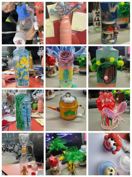 活动当天,校园内洋溢着浓厚的环保氛围。师生们积极参与,将废弃塑料瓶等可回收物资转化为创意作品,展现了他们的环保理念和创新精神。在众多令人印象深刻的作品中,特等奖作品“塑料瓶上的长青之花”以其独特的设计和深刻的环保寓意脱颖而出,而一等奖的“易拉罐茶壶”则以其精致的工艺和实用性赢得了评委的青睐。