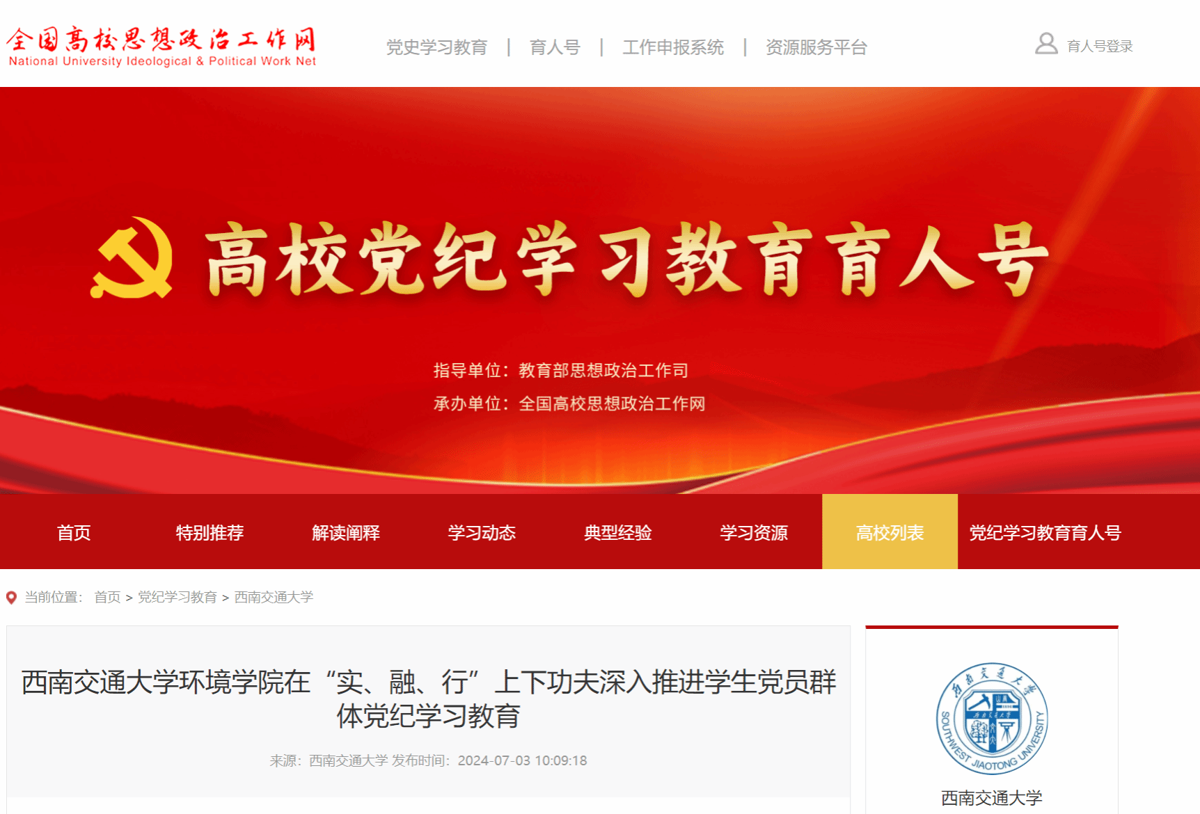 以“行”促效,实践育人有广度。以“行”固信念。博士环境党支部与蒲江县水务局也开展联学共建活动,通过校企共建共学共研,激励青年党员矢志环境报国,做习近平生态文明思想的忠实践行者;本研支部、教工支部前往成飞公园开展国防教育研学,学习航空报国精神,坚定理想信念,汲取奋进力量;参观“学习强国”主题街区,在强化理论学习与实践结合。以“行”做示范。积极响应“美丽中国,大学生在行动”号召,前往成都市实验小学开展“无废”生活主题宣讲活动;积极参与“集体劳动日”系列活动,在美化校园环境的过程中,促进动实践育人;开展毕业生党员系列活动,让毕业生牢记“感恩”、“忠诚”、“廉洁”;开展党员网络行为宣传,积极号召学生党员在网络行为中做示范。以“行”促服务。联合学校图书馆开展布展、图书扫描等志愿工作,在服务的过程中强化服务和奉献意识;协助学校后勤保障部、金牛区综合执法局垃圾分类办及金牛区人民政府九里堤街道办事处,开展城市生活垃圾分类宣传活动,通过向市民真切宣传互动,加强环保理解,浸润环保初心。