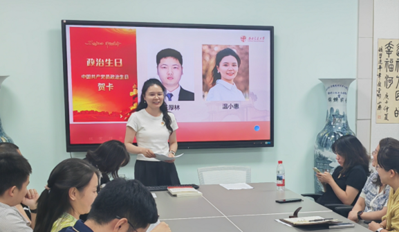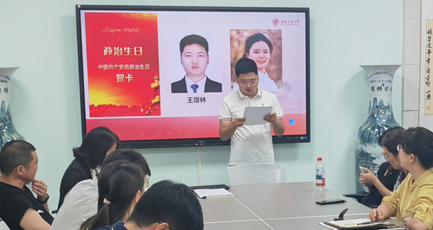 研讨交流结束后,支部为入党时间在10月份的两位党员王厚林和温小惠同志集中过“政治生日”。两位同志深情地重温了入党申请书,支部书记张胜利同志向他们赠送了政治生日礼物《环境专业课程思政教学设计》,希望他们在做好科研的同时,努力提高课程思政教学能力。
