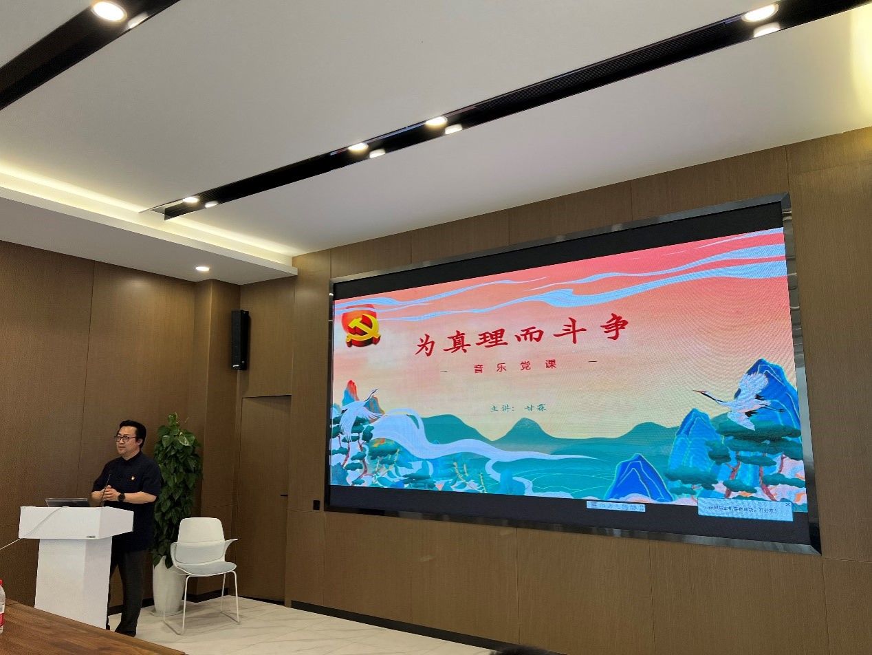 随后,学院党委书记甘霖同志为全院党员同志讲授音乐党课《为真理而斗争》。甘霖同志用丰富的史料故事、感人的影像视频、声情并茂的讲授为教师党员介绍了《国际歌》、《三大纪律八项注意》和《我宣誓》三首歌曲的由来和背后的故事。