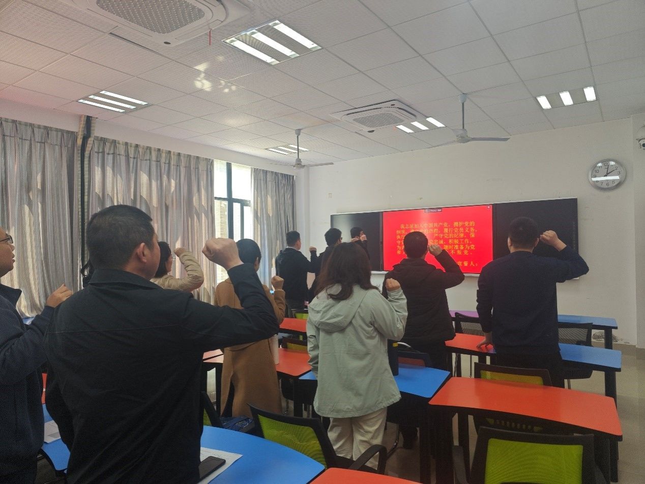 首先,支部教师党员重温入党誓词。全体教师党员举起右手,握紧拳头,重温入党誓词。