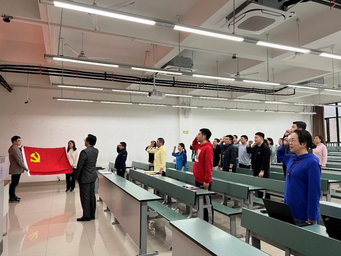 首先,学院党委书记甘霖同志带领全院教师党员重温入党誓词,全体教师党员在党旗前举起右手,握紧拳头,庄严宣誓。