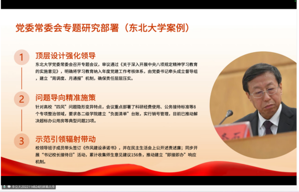 李立天同志则带领学习《全体党员精心谋划求实效 凝心聚力树新风——教育部直属高 校全面启动深入贯彻中央八项规定精神学习教育综述》,并跟进学习习近平总书记近期重要讲话精神。他介绍了教育部直属高校深入贯彻中央八项规定精神学习教育的情况,如提高站位、以上率下等举措及成效,强调高校加强作风建设对落实立德树人、建设教育强国的重要性。