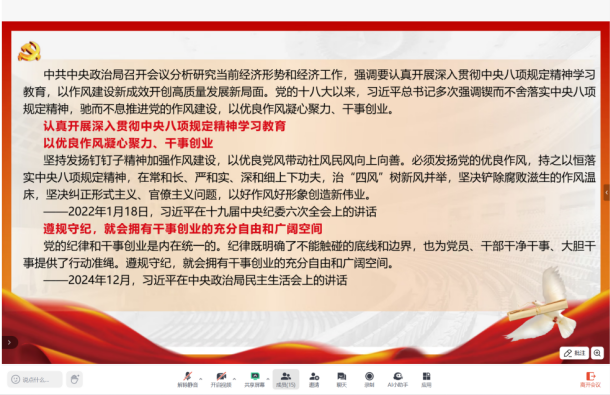 随后,刘颖暄同志带领大家学习《新时代加强党的作风建设的锐利思想武器 —— 学习习近平总书记关于加强党的作风建设的重要论述》和《以作风建设新成效开创高质量发展新局面》。她着重强调,习近平总书记的相关论述高屋建瓴,为党的作风建设精准指明方向,中央八项规定作为长期有效的准则,各级党组织和党员必须常抓不懈,持续整治 “四风”、积极树立新风,从而推动党和国家事业蓬勃发展。