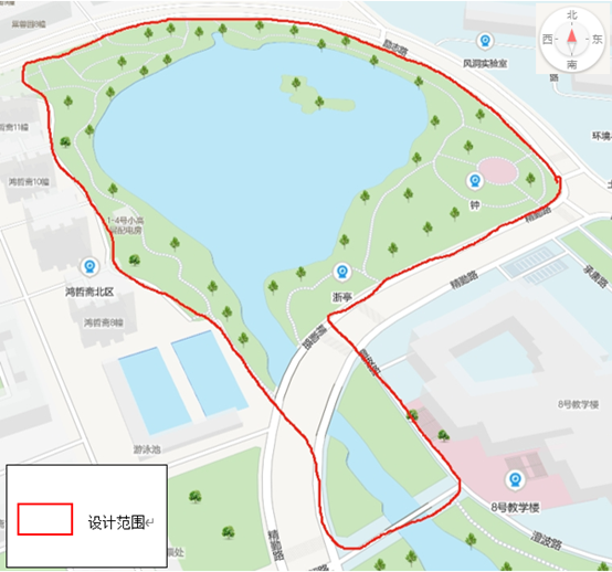 本次大赛的设计范围为:以犀湖为核心,北至校园围墙,南至八教前人行桥,具体见下图红线范围内。
