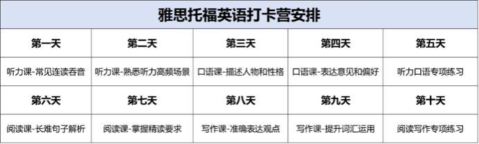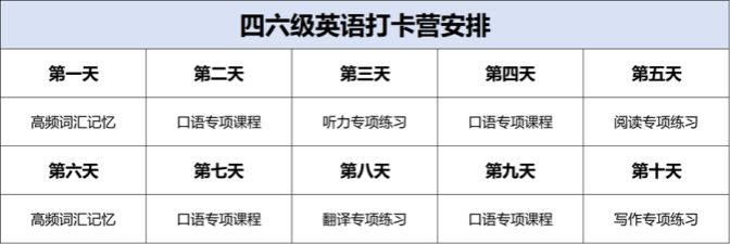 课程一共2个阶段,共10天,包括听力、口语、阅读、写作4个板块。每个阶段5天,其中前4天完成视频课程学习,后1天完成练习。