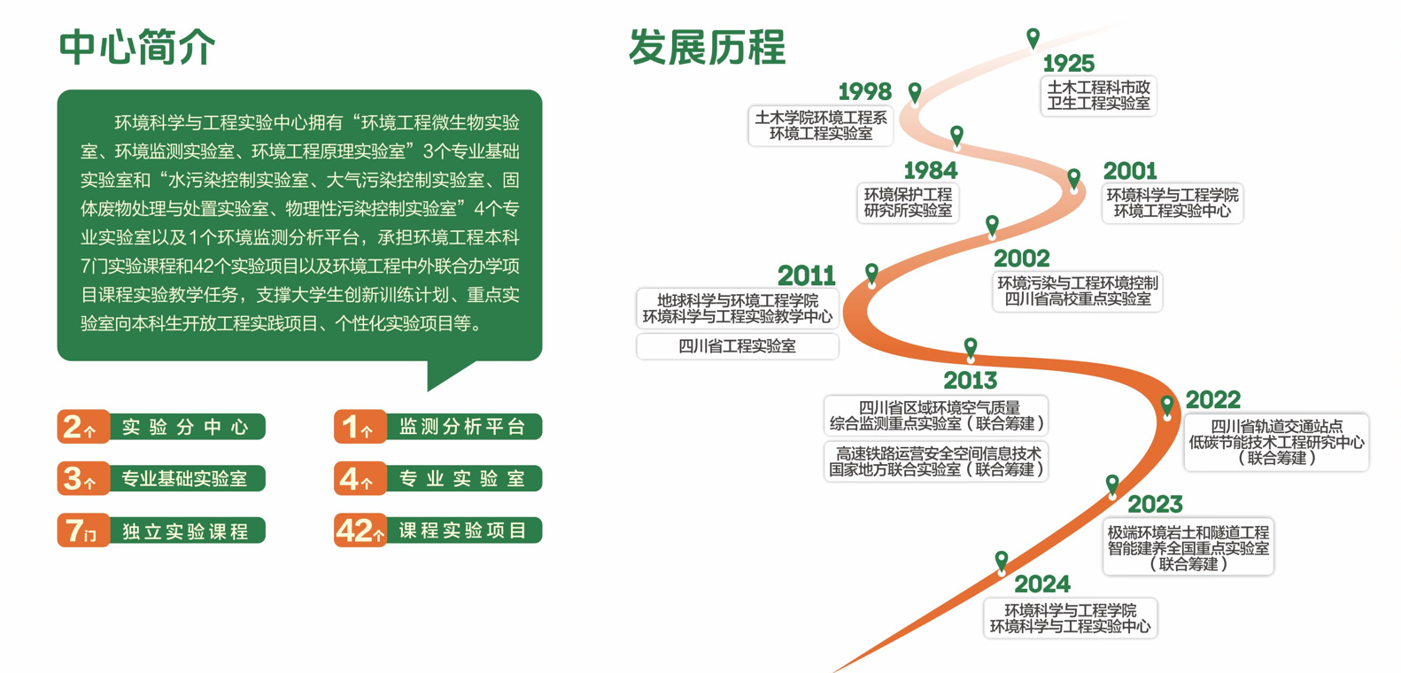 环境科学与工程实验中心(环境保护工程研究所实验室)成立于20世纪80年代,1998年土木工程学院设立环境工程系后,设立环境工程实验室;2001年成立成人卡通 ,设立成人卡通 环境工程实验中心,2002年被批准为环境污染与工程环境控制四川省高校重点实验室;2010年11月,该学院与测绘学科、地质学科整合,组建地球科学与环境工程学院,与测绘科学与技术实验中心、地质资源与地质工程实验中心、消防工程实验中心合并成立高速铁路地球科学与环境工程实验教学中心,并于2022年获批四川省省级实验教学示范中心;2023年因学科调整,成人卡通 成立,2024年获批轨道交通智慧环保与可持续发展国际科技合作基地、轨道交通工程污染防治四川省工程研究中心。